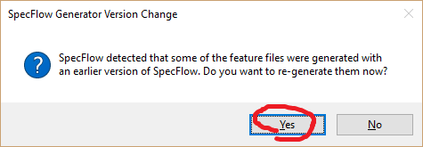 6. Re-generate feature files as suggested by the popup. If everything is fine, as you have opened the feature file, you will see a popup that there is a detected version change. Select “Yes”.